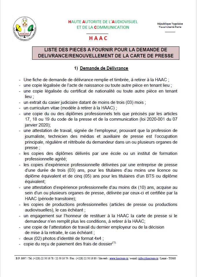 Liste des pièces de demande de carte de presse En cours de chargement… Cela prend trop de temps ? Recharger le document | Ouvrir dans un nouvel onglet Télécharger [297.88 KB] Navigation de l’article LISTE DES PIECES A FOURNIR POUR LA DEMANDE DE RECEPISSE DE DECLARATION DE D’EXPLOITATION DE SITE POUR LES SOCIETES DE PRESSE EN LIGNE EN MODE ECRIT RAPPORT D’ACTIVITES 2023 DE LA HAAC